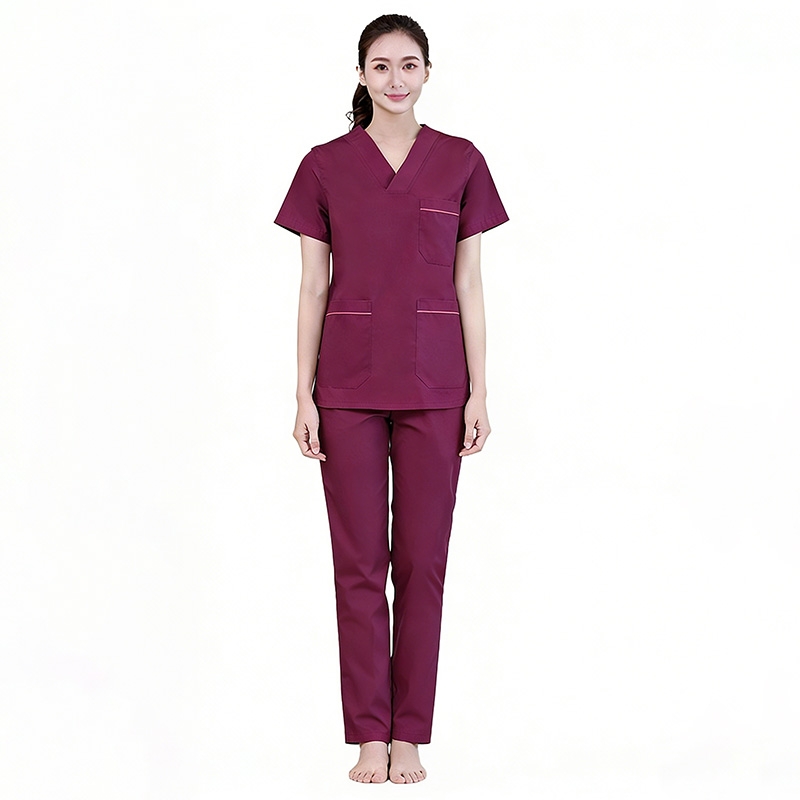 深紫紅色醫護套裝,女短袖V領上衣三口袋,直筒長褲,挺括面料