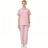 女款粉色醫護服短袖V領撞色裝飾三口袋醫療護理工作服透氣護工套裝