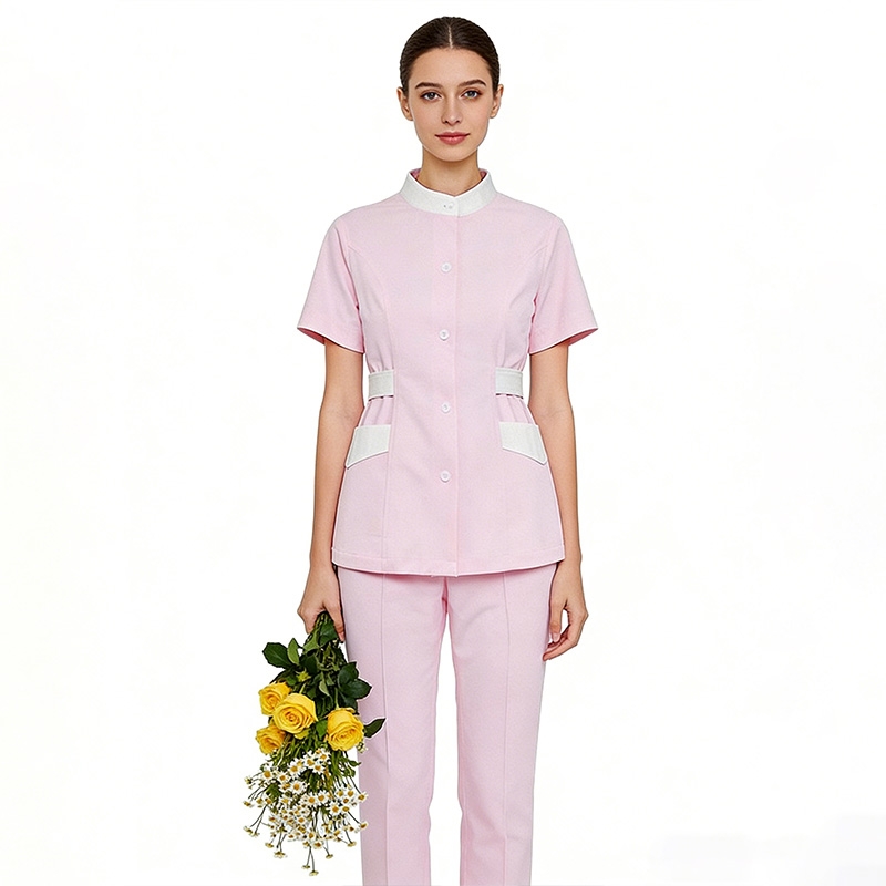粉色立領短袖護士服套裝,撞色收腰醫護工作服女,透氣親膚護理職業裝