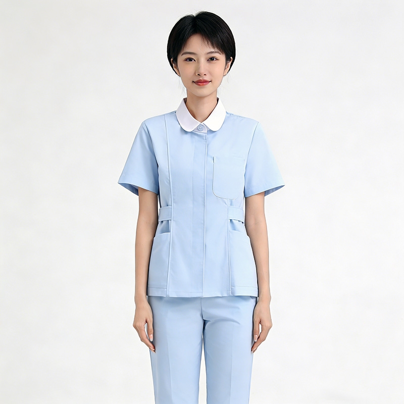 女士淺藍短袖護士工作服,滌綸棉質透氣,內置紐扣,醫療場所專用制服套裝