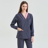 女式醫護工作服長袖,彈力羅紋袖口V領撞色,多隔層口袋服裝兩件套