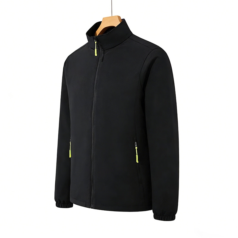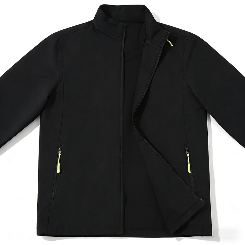 設計風格:採用經典黑色,簡約立領 + 全拉鍊設計,搭配螢光綠拉鍊頭作為視覺點綴,風格利落幹練,適配戶外通勤、團隊活動等場景。