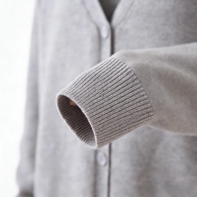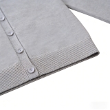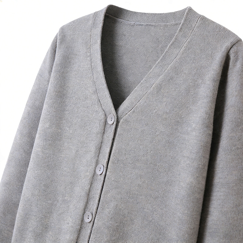 這是一款灰色 V 領針織開衫,是兼具簡約感與實用性的基礎百搭單品。