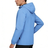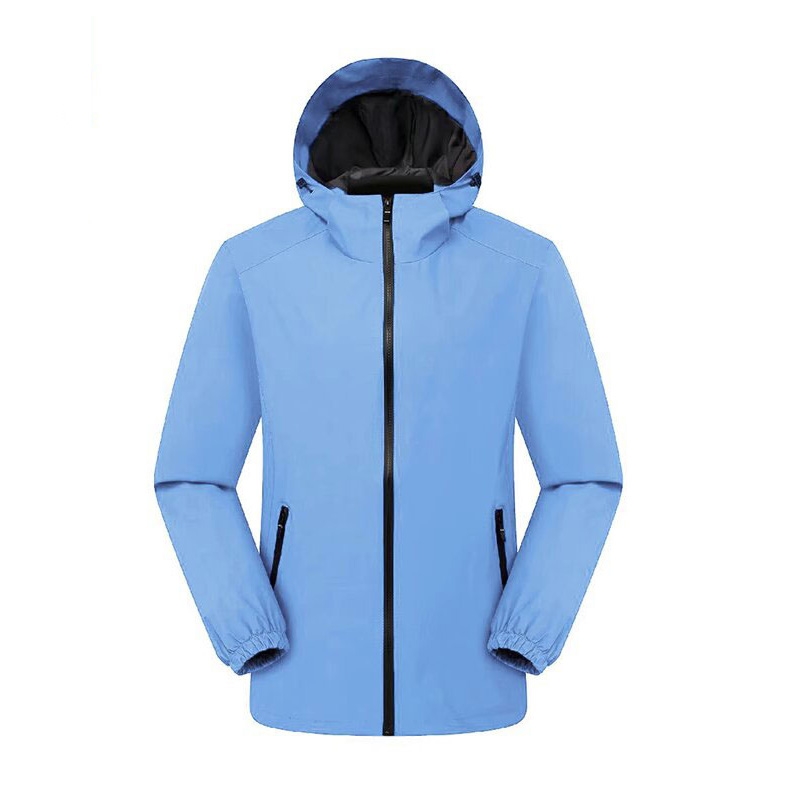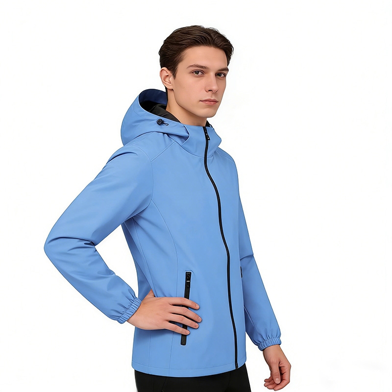 設計風格:採用柔和的淺藍色,簡約連帽 + 全拉鍊設計,搭配黑色拉鍊及內襯作為視覺對比,風格清新利落,適配日常通勤、輕戶外及團隊活動場景。