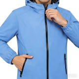 這是一款淺藍連帽防風防雨外套,是兼具清新感與功能性的春秋季百搭單品。