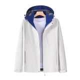 中性款淺灰色戶外夾克,可拆卸連帽多用途防水外套