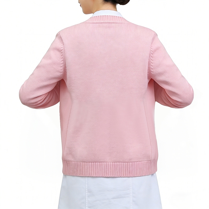 這是一款粉色加絨醫護專用針織開衫,是兼具保暖性與親和力的醫護人員值班外套。