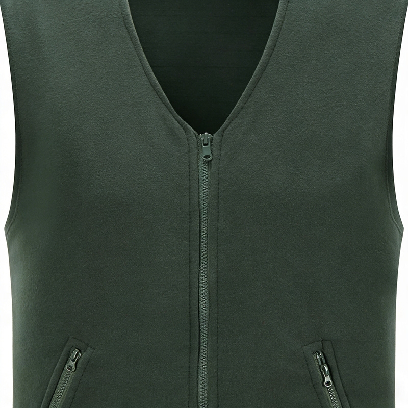 設計風格:採用低飽和度的深軍綠色主體,V 領 + 拉鏈開合,無袖版型簡約利落,風格低調且富有功能性,適配戶外戰術、日常通勤及城市輕運動場景。