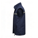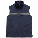 設計風格:採用沉穩的藏青色主體 + 胸前橫向反光條設計,立領 + 拉鏈開合,無袖版型簡約利落,風格低調且富有功能性,適配戶外工作、夜間執勤、物流配送等場景。