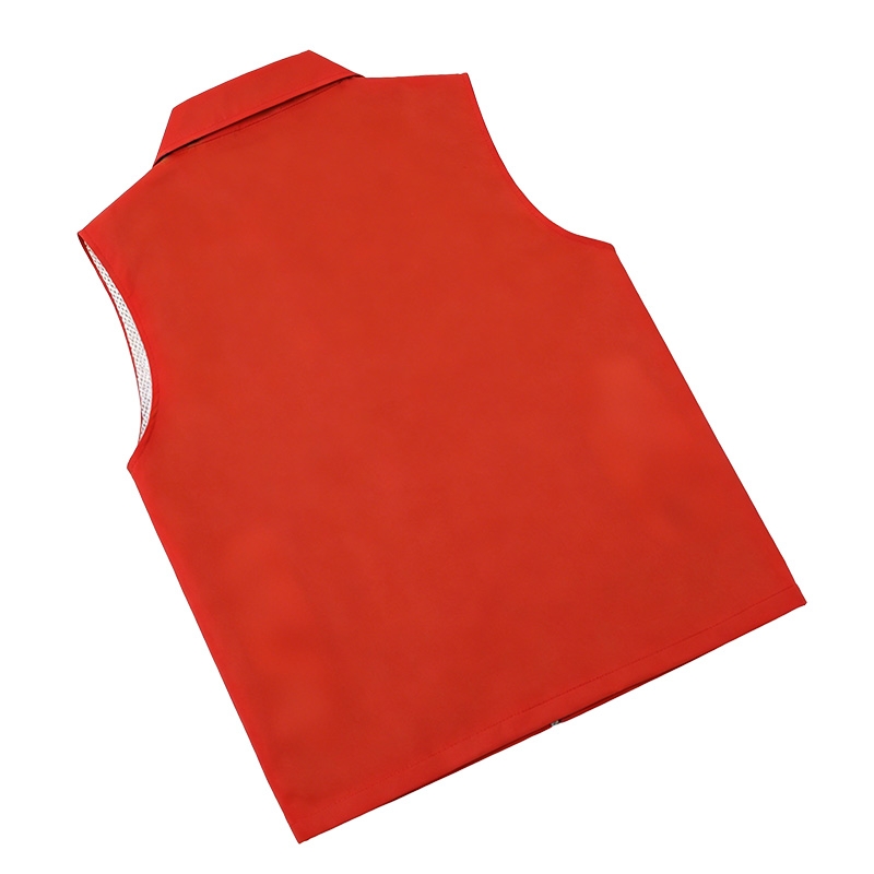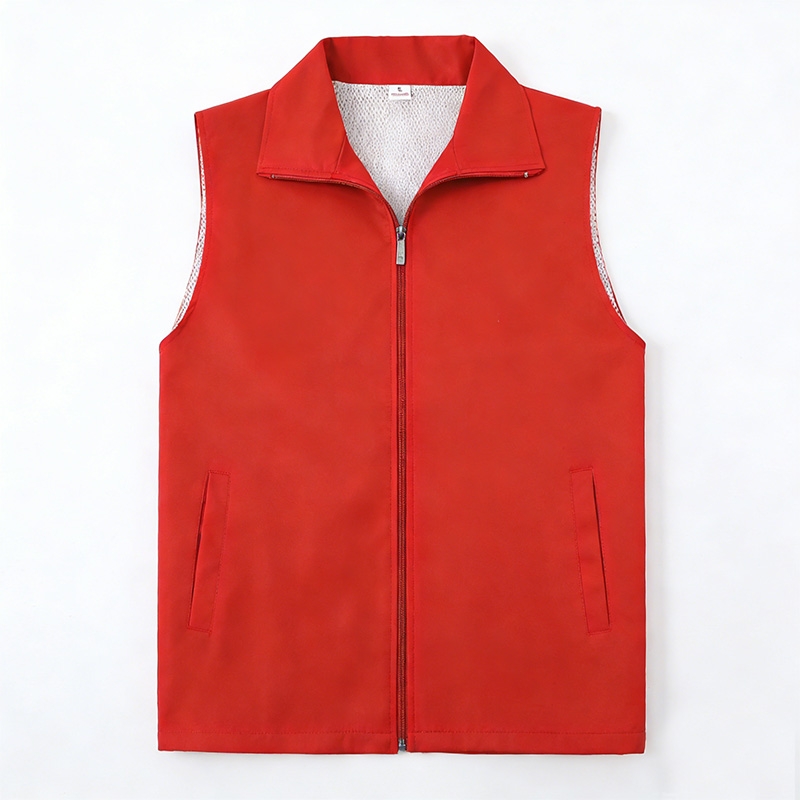 設計風格:採用高飽和度的正紅色主體,翻領 + 拉鏈開合,無袖版型簡約利落,風格醒目且富有親和力,適配公益活動、社區服務、展會接待等場景。