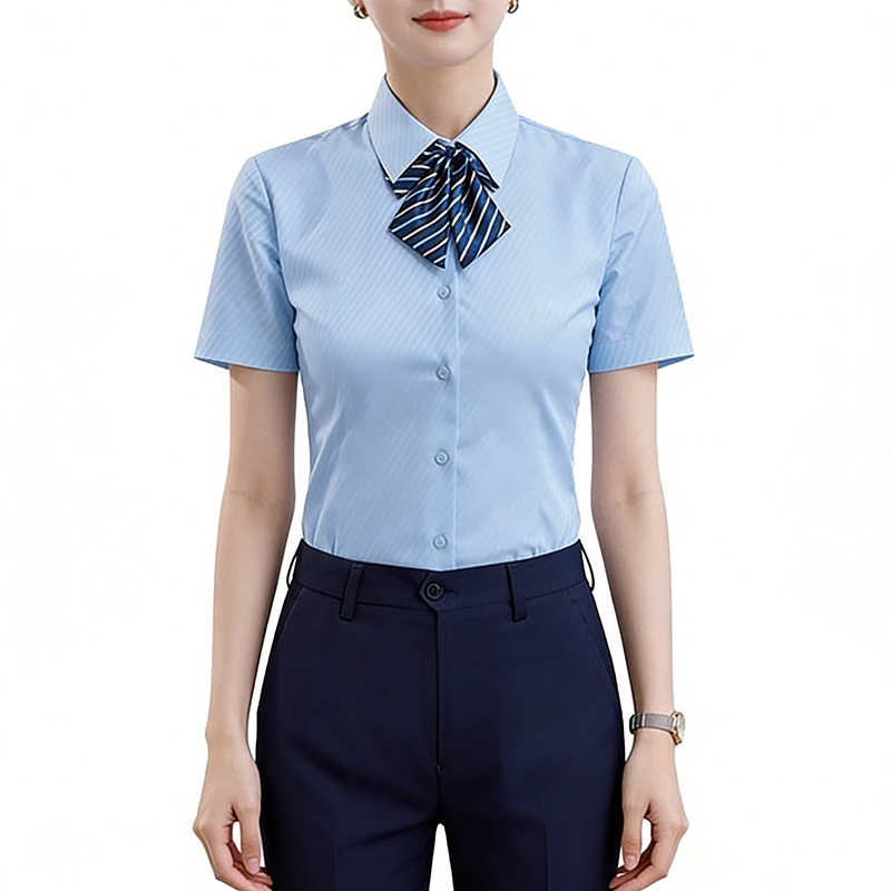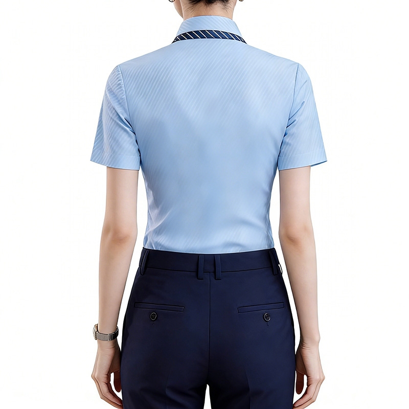 設計風格:採用柔和的淺藍色底 + 細白條紋,尖領 + 單排扣設計,搭配可拆卸條紋領結,短袖版型簡約利落,風格專業且富有辨識度,適配金融、航空、酒店等服務業場景。