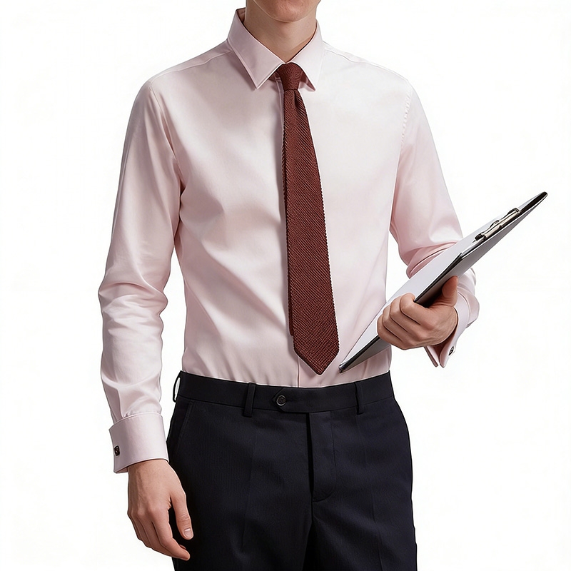 細節亮點:法式袖口設計增加精緻感,可搭配袖扣提升造型層次;深棕色領帶與裸粉色襯衫形成柔和對比,弱化正裝的嚴肅感;裸粉色比傳統深色更柔和,適配各類膚色與西裝、西褲組合,通用性強。