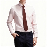 這是一套男士裸粉色尖領長袖襯衫 + 深棕領帶的商務套裝,是兼具優雅感與專業感的職場及輕正式場合必備單品。