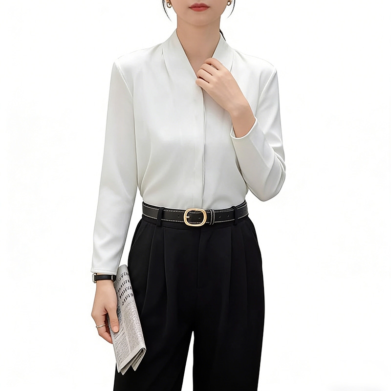 這是一件白色 V 領垂感襯衫,是兼具優雅感與適配性的職場及日常必備單品。