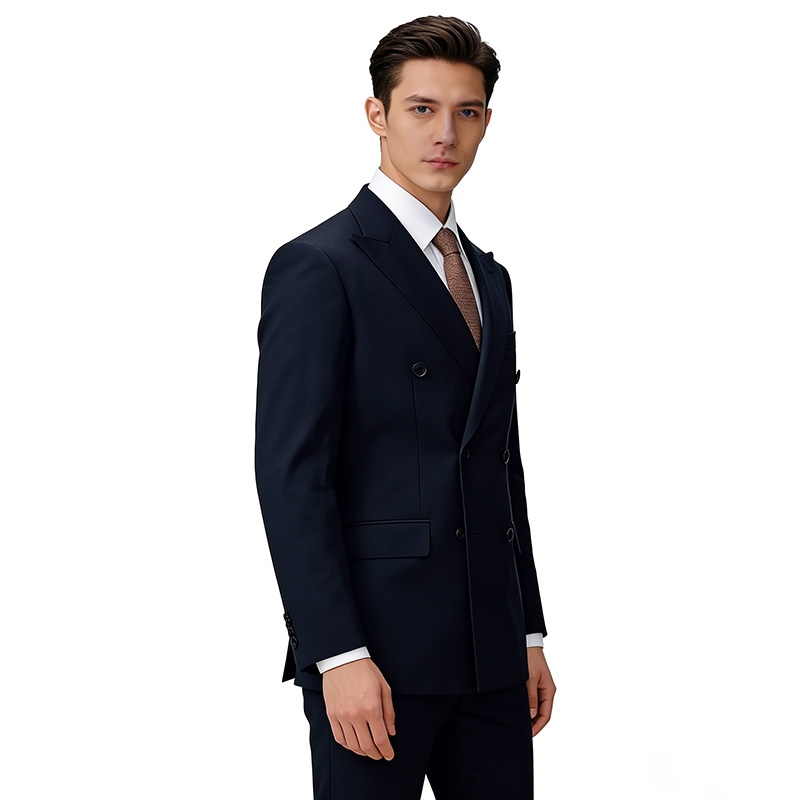 設計風格:採用沉穩的藏青色,平駁領 + 雙排扣設計,版型修身利落,風格大氣莊重,適配高階商務會議、婚禮、晚宴等正式場景。