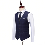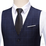 這是一件藏青格紋西裝馬甲,是兼具精緻感與實用性的職場及正式場合搭配單品。