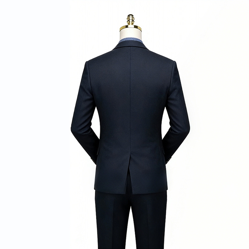 設計風格:採用沉穩的藏青色,平駁領 + 兩粒扣單排扣外套搭配同色系雙排扣馬甲,層次豐富,風格精緻大氣,適配高階商務會議、婚禮、晚宴等正式場景。