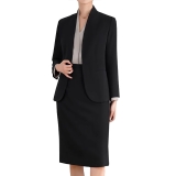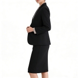 設計風格:採用經典純黑色,無領簡約外套搭配同色系及膝半裙,版型修身利落,風格大氣端莊,適配職場通勤、商務會議及輕正式社交場景。