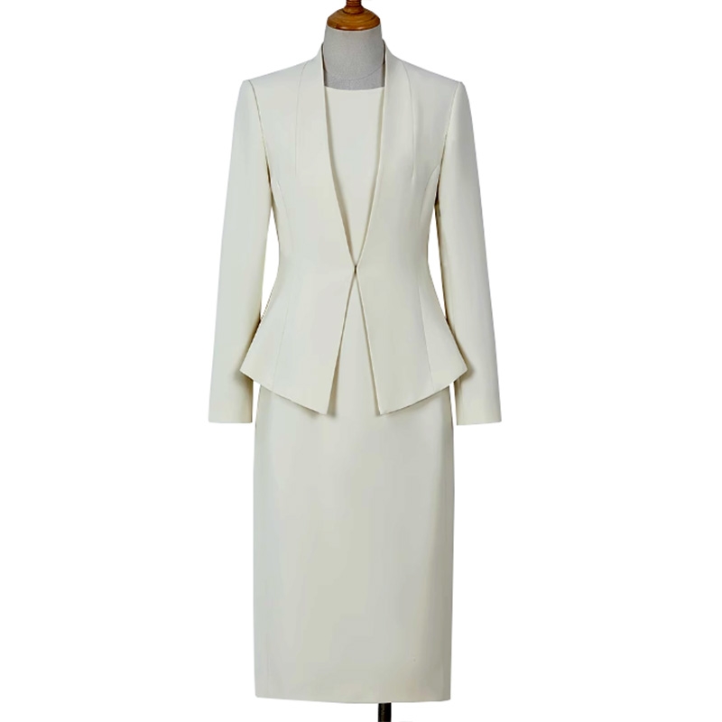 這是一套米白色假兩件西裝連衣裙,是兼具優雅感與專業感的高階職場及正式場合單品。