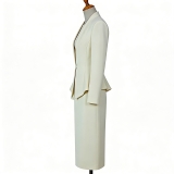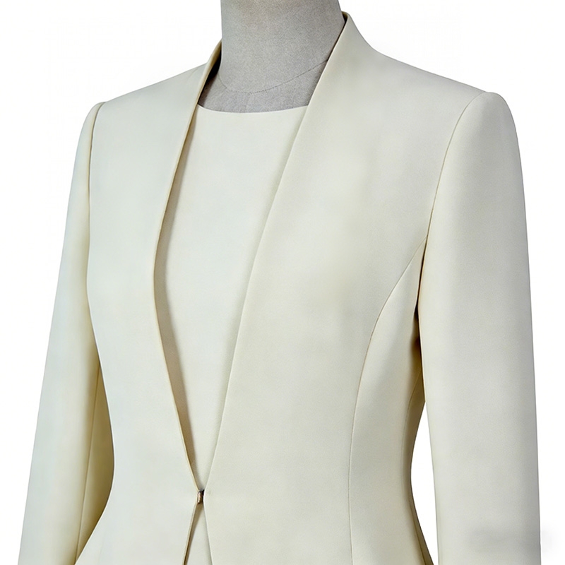 設計風格:採用柔和的米白色,西裝翻領 + 單扣收腰設計,結合假兩件結構與荷葉邊下擺細節,版型修身利落,風格清新雅致,適配高階商務會議、職場通勤及正式社交場景。