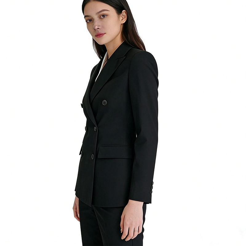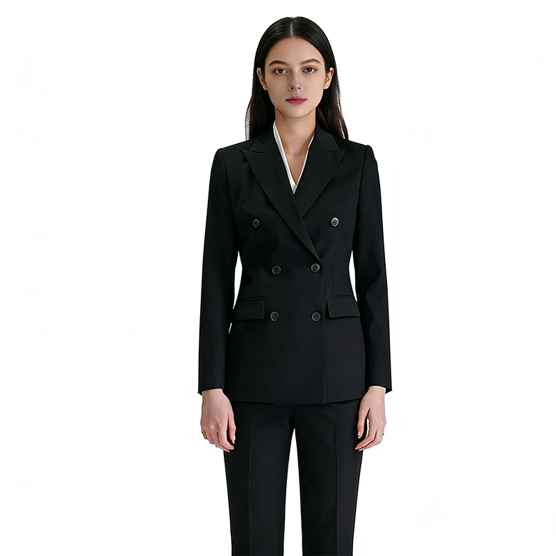 設計風格:採用經典純黑色,平駁領 + 雙排扣設計,搭配同色系直筒西褲,版型修身利落,風格大氣莊重,適配高階商務會議、職場通勤及正式社交場景。