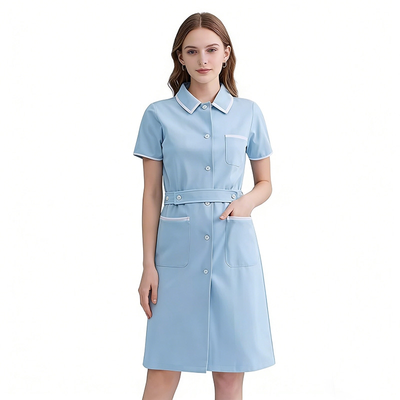 清新淺藍護士服,收腰繫彈力醫護連衣裙