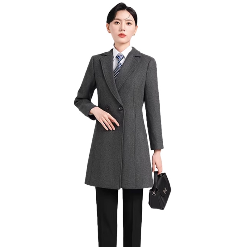 這是一件深灰色雙排釦中長款女士毛呢大衣,是兼具專業感與優雅感的秋冬通勤及商務場合必備單品。