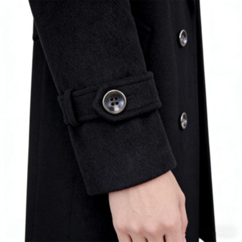 設計風格:採用經典黑色主體,西裝領 + 雙排釦設計,中長款版型簡約利落,風格大氣且富有穩重感,適配職場通勤、商務會議及正式活動等場景。