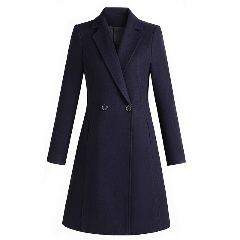 細節亮點:雙排釦設計增加服裝的層次感與正式感;西裝領設計可拉長頸部線條,搭配襯衫或高領毛衣時造型感更強;中長款版型可覆蓋臀部,提升保暖性與修飾身材效果;藏青色比黑色更柔和,適配各類膚色與內搭組合,通用性強。