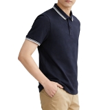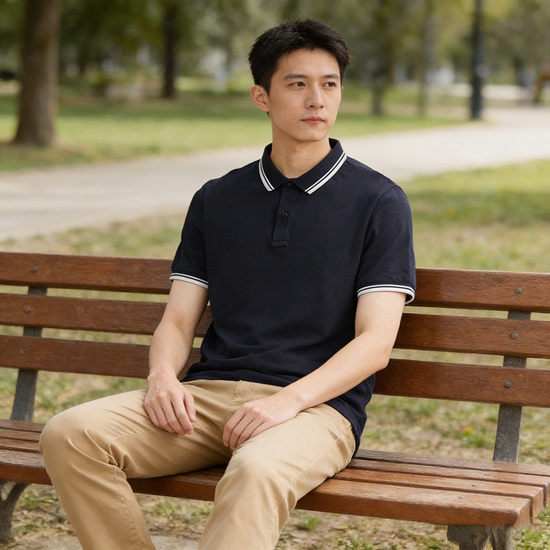 這是一款藏青撞色領男士短袖 Polo 衫,是兼具穩重感與精緻感的百搭單品。