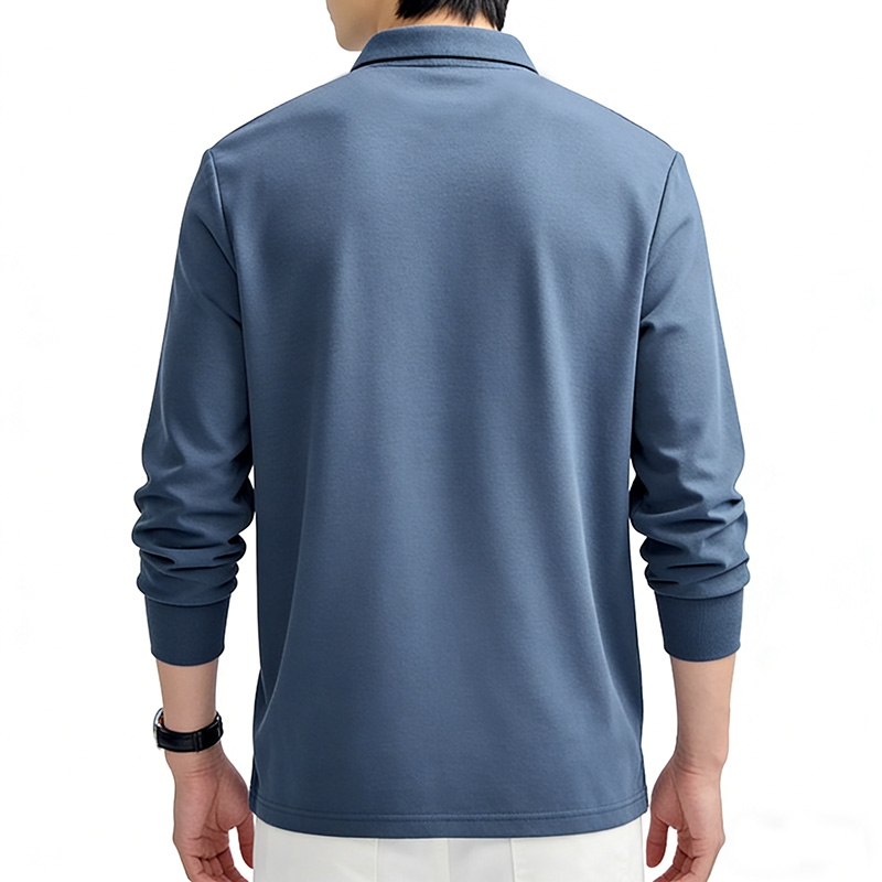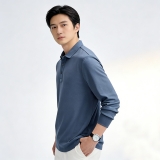 這是一款霧霾藍長袖 Polo 衫,是兼具高級感與實用性的百搭單品。