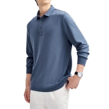 設計風格:採用低飽和度的霧霾藍色,經典翻領 + 兩粒扣門襟設計,版型修身利落,既保留了 Polo 衫的商務屬性,又通過柔和色彩增添休閒感,適配日常通勤與輕商務場景。