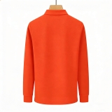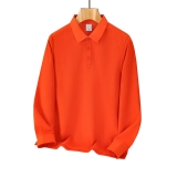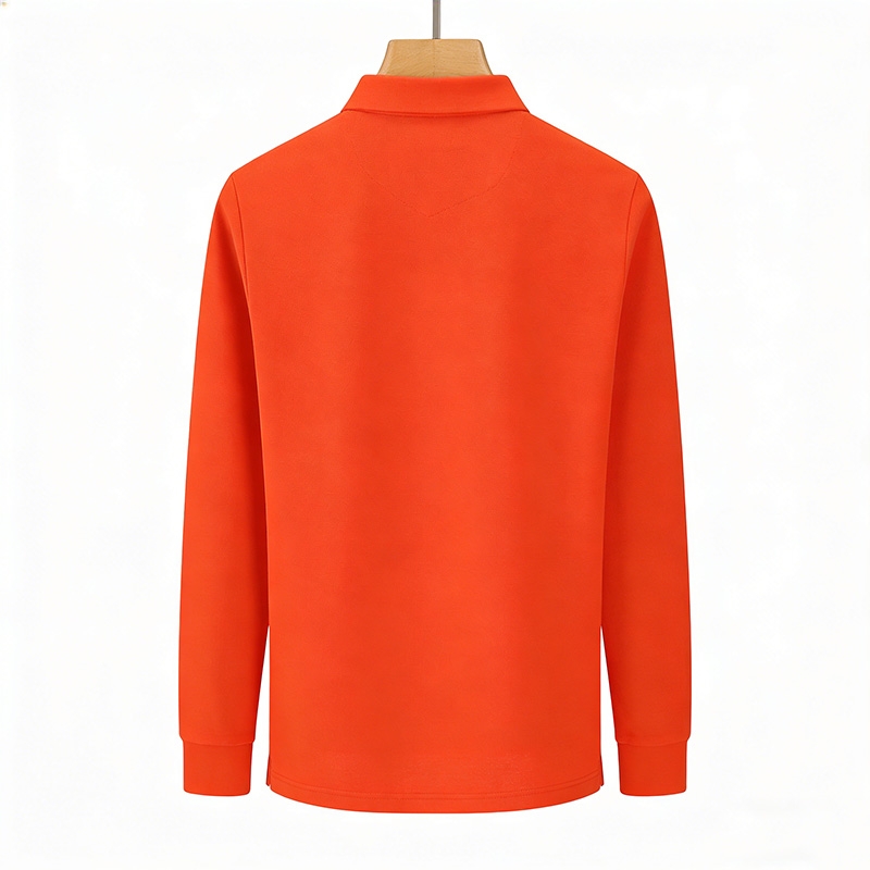 這是一款活力橙長袖 Polo 衫,是兼具活力感與實用性的百搭單品。