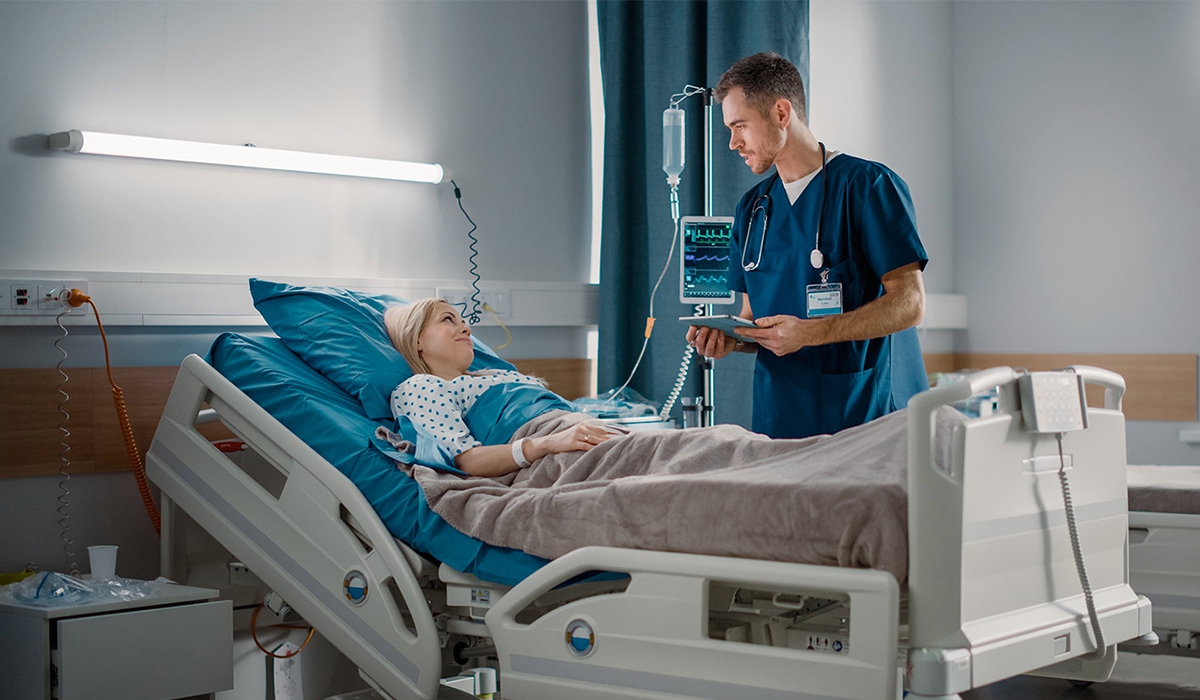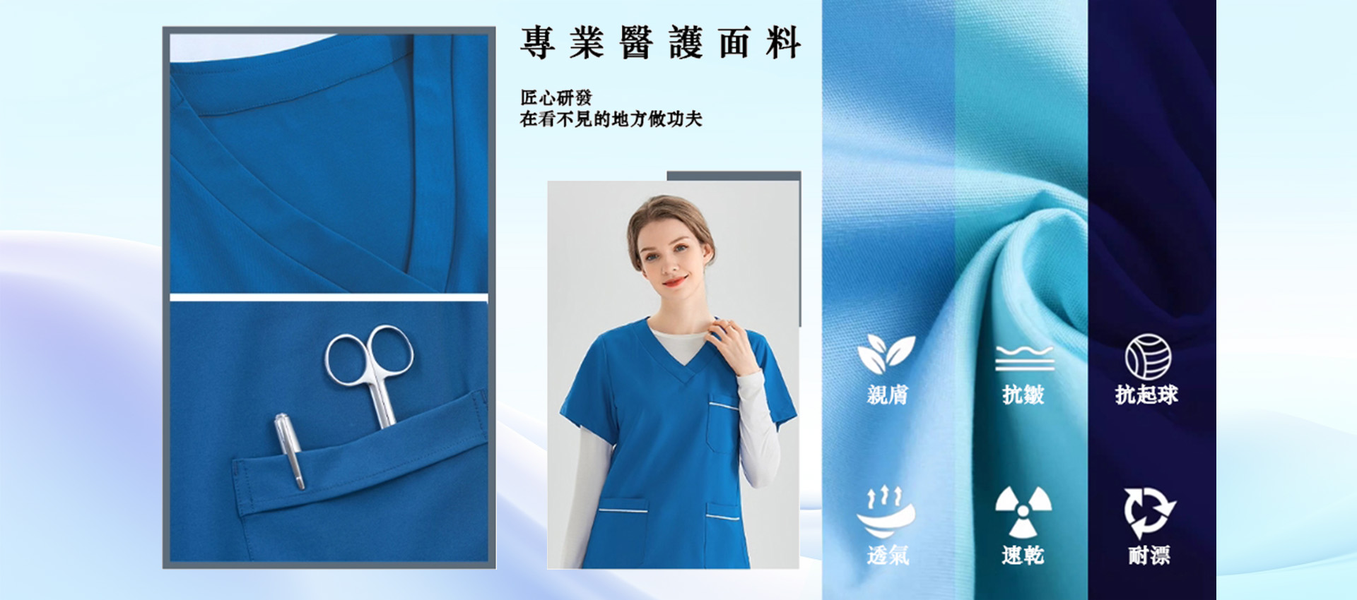 醫院護士工作服,短袖手術服,白色與藍色裝飾邊,多口袋設計,耐用且易於護理的材質