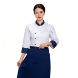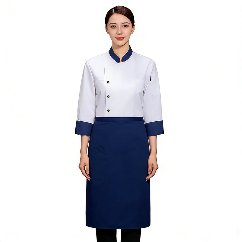 藍白色飾邊制服套裝 七分袖帶圍裙廚房外套 專業廚師着裝