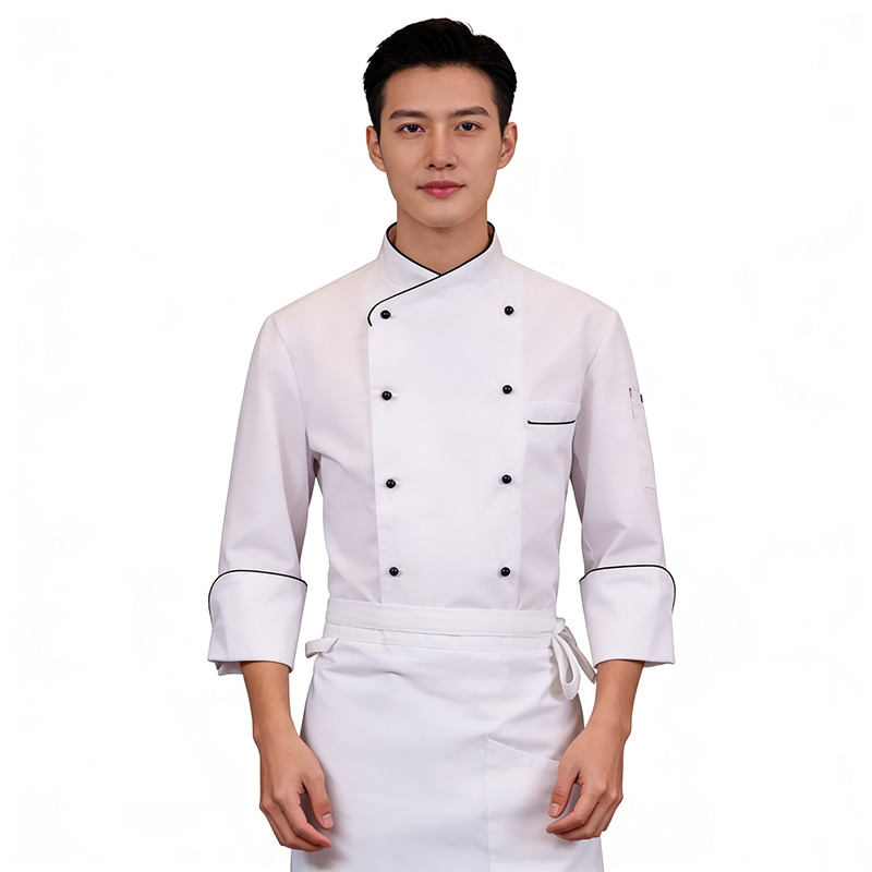 細節亮點:雙排釦設計便於快速更換,避免污漬影響美觀;黑色包邊提升服裝的精緻感與辨識度;立領設計可阻擋油煙,保持頸部清潔;圍裙可有效保護衣物,延長使用壽命。