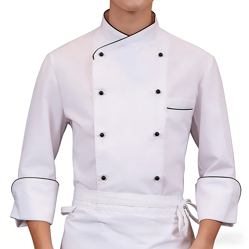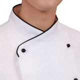 設計風格:採用經典白色主體,立領 + 雙排釦設計,搭配黑色包邊細節,整體風格乾淨利落且富有專業感,適配各類餐廳、酒店廚房等工作場景。
