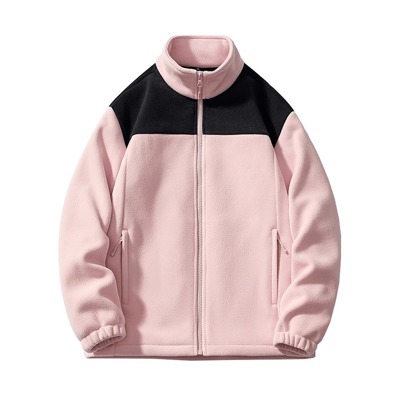 This is a pink-black colorblock stand-collar fleece jacket, a versatile autumn/winter item that balances warmth and style.