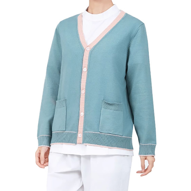 This is a mint green contrast V-neck knit cardigan, a specialized knit jacket for medical staff that balances professionalism and approachability.