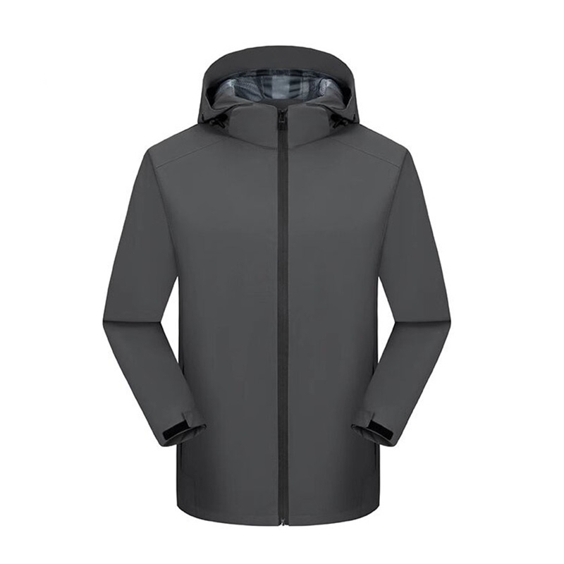 This is a dark gray hooded windproof and rainproof jacket, a versatile spring/autumn item that balances professionalism and practicality.