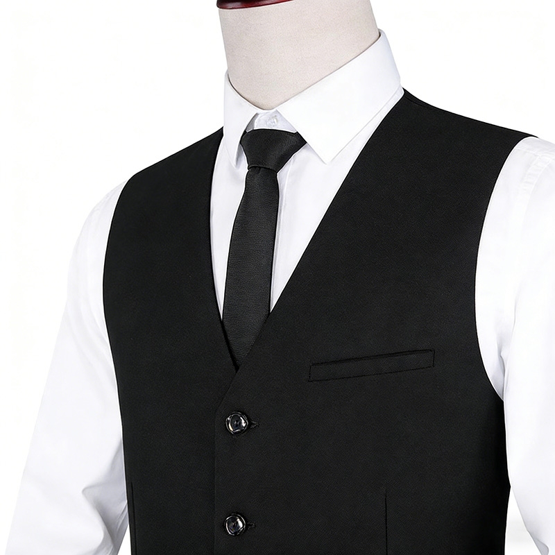 Detail Highlights: Equipped with a breast pocket and flap pockets for accessories or small items; the pointed hem enhances body proportions; the pure black design is highly versatile, and it can be paired with shirts, ties, suit jackets, and other items to create a complete formal look, or worn alone as a casual layering piece.