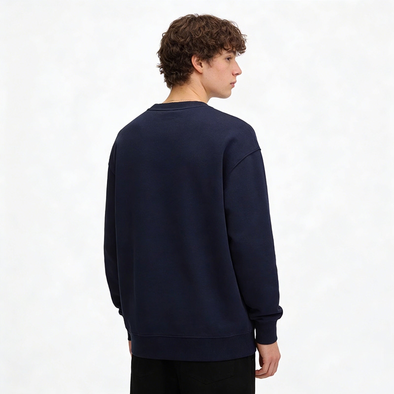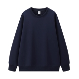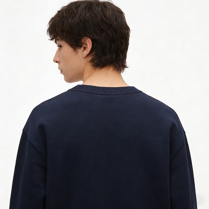 This is a navy blue crew neck sweatshirt, a versatile autumn/winter item that balances warmth and minimalism.