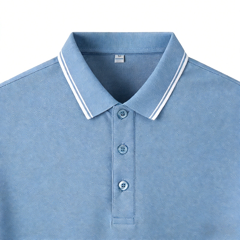 Design Style: Features a low-saturation haze blue body with white contrast trim on the collar. It retains the classic Polo shirt silhouette while adding subtle refinement through the low-key contrast, suitable for both daily casual and light business scenarios.