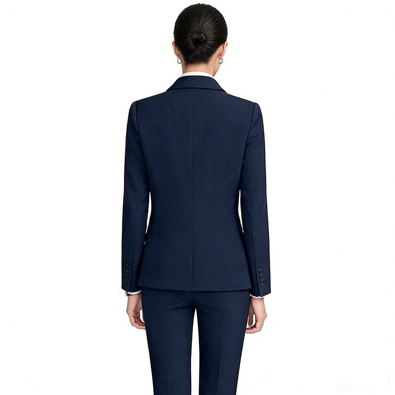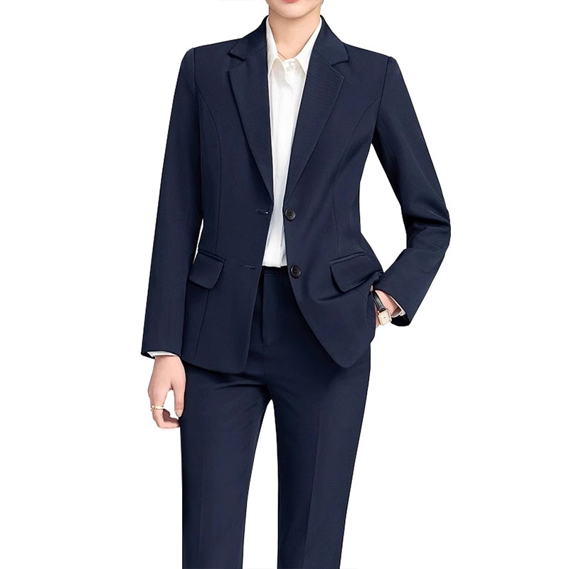 This is a navy blue women's business suit set, an essential workplace item that balances professionalism and versatility.