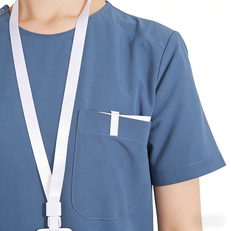 醫院護士工作服,短袖手術服,白色與藍色裝飾邊,多口袋設計,耐用且易於護理的材質