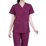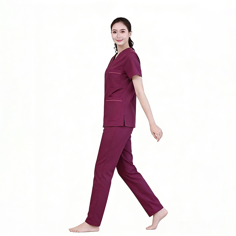 深紫紅色醫護套裝,女短袖V領上衣三口袋,直筒長褲,挺括面料