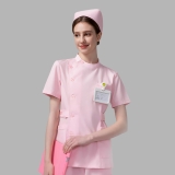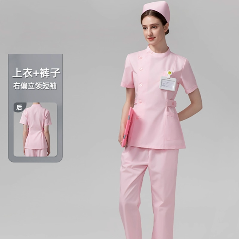 女醫護專用粉色分體工作服 V領帶口袋短袖上衣+寬鬆長褲,制服服定製