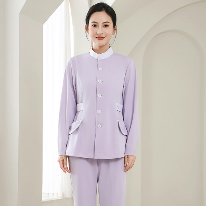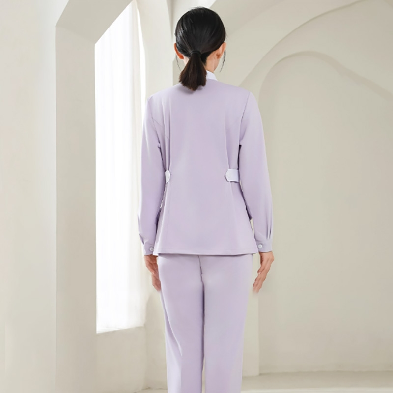 女士淺紫色護士服套裝,長袖帶口袋專業醫療工作服,護士專用護理制服