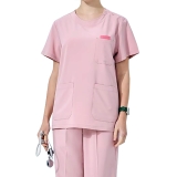 女款粉色醫護服短袖V領撞色裝飾三口袋醫療護理工作服透氣護工套裝