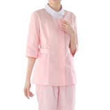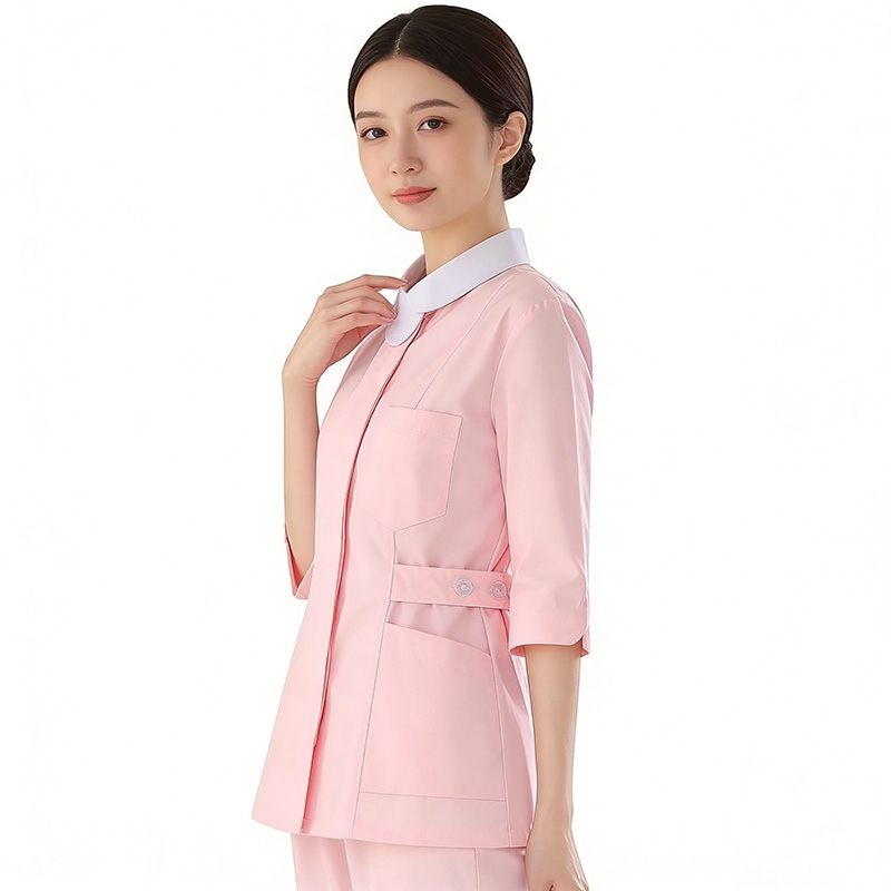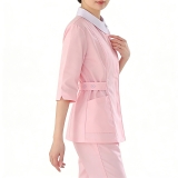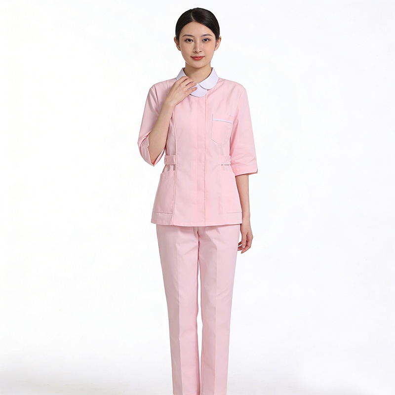 春秋粉色娃娃領中袖護士服套裝,白色領醫護工作裝,護理人員修身職業制服